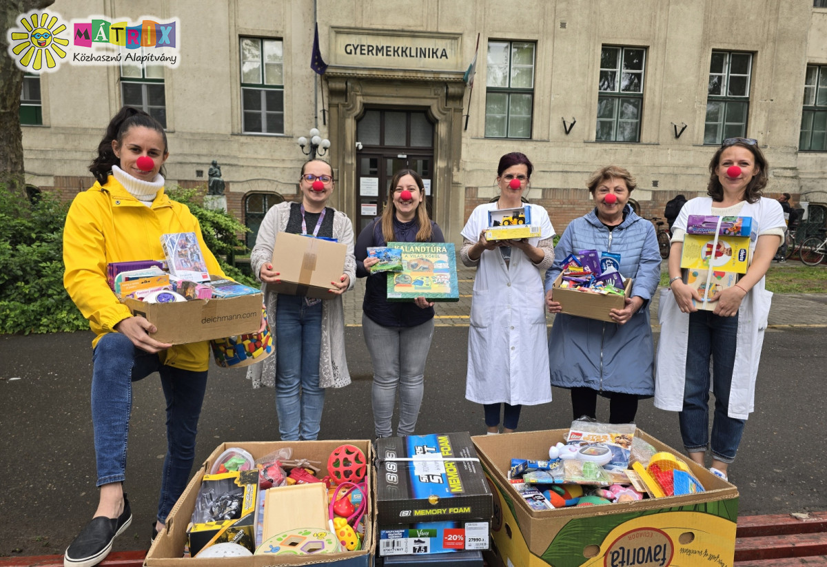 A Mátrix Közhasznú Alapítvány bohócdoktor csapata gyermeknap alkalmából játékokat adományozott gyermekklinikák részére. A bohócdoktorok jótékonysági megmozdulásának a célja, hogy örömet szerezzenek a kórházban gyógyuló gyerekeknek, és mosolyt csaljanak arcukra a nehéz napok közepette is. Évente 70-80 gyermekkórházat, gyermekegészségügyi intézményt, sok száz szakdolgozót, több ezer kisgyermeket sikerül így támogatni. Segítenél?! Megteheted!